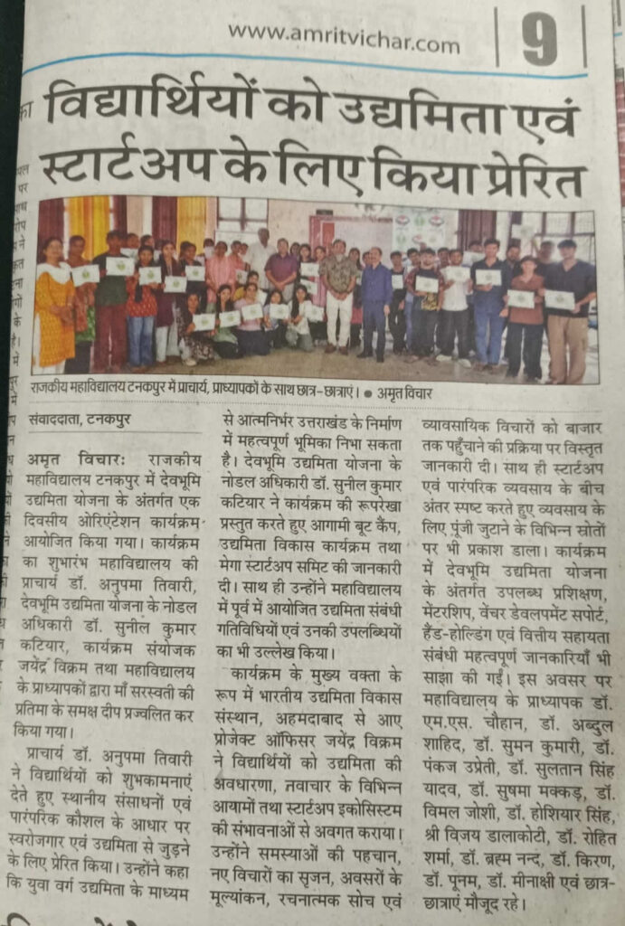 कार्यक्रम में देवभूमि उद्यमिता योजना के अंतर्गत उपलब्ध प्रशिक्षण, मेंटरशिप, वेंचर डेवलपमेंट सपोर्ट, हैंड-होल्डिंग एवं वित्तीय सहायता संबंधी महत्वपूर्ण जानकारियाँ भी साझा की। इस अवसर पर महाविद्यालय के प्राध्यापक डॅा. एम एस चौहान ,डॉ. अब्दुल शाहिद,डॉ.सुमन कुमारी.डॉ. पंकज उपरेती डॉ.सुलतान सिंह यादव..डॉ. सुषमा मकड़,डॉ. विमल जोशी,डॉ. होशयार सिंह से. विजय डाला कोटी,डॉ. रोहित शर्मा,डॉ. ब्रह्म नन्द,डॉ.किरण,डॉ. पूनम,डॉ. मिनेक्षी,एवं बड़ी संख्या में छात्र-छात्राएँ उपस्थित रहे।